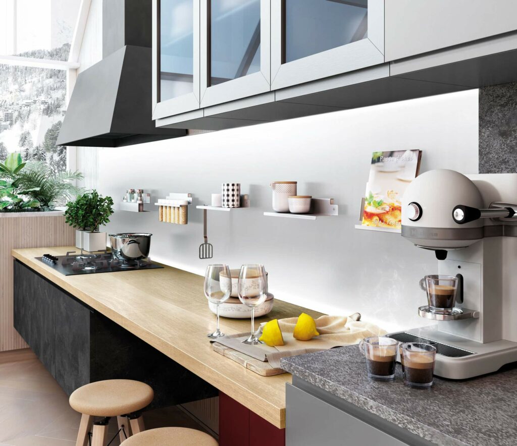 Cucina moderna ancora più contemporanea e personalizzabile nella sua versione FEEL! Caratterizzata dall’ elegante maniglia intagliata e sagomata nell’anta, una lavorazione raffinata e preziosa che dona all’anta liscia un design essenziale e moderno ed una funzionalità e praticità unica. L’anta è valorizzata dalle scelte delle materiche essenze legno in tre fresche tinte, abbinate a tre colorazioni in opaco soft che convivono in modo armonico donando la possibilità di creare composizioni moderne che si adattano a qualsiasi ambiente abitativo, oggi rinnovata con ancora più varianti colore e materico per liberare la tua fantasia e creare la tua cucina con un tocco personale ed unico.